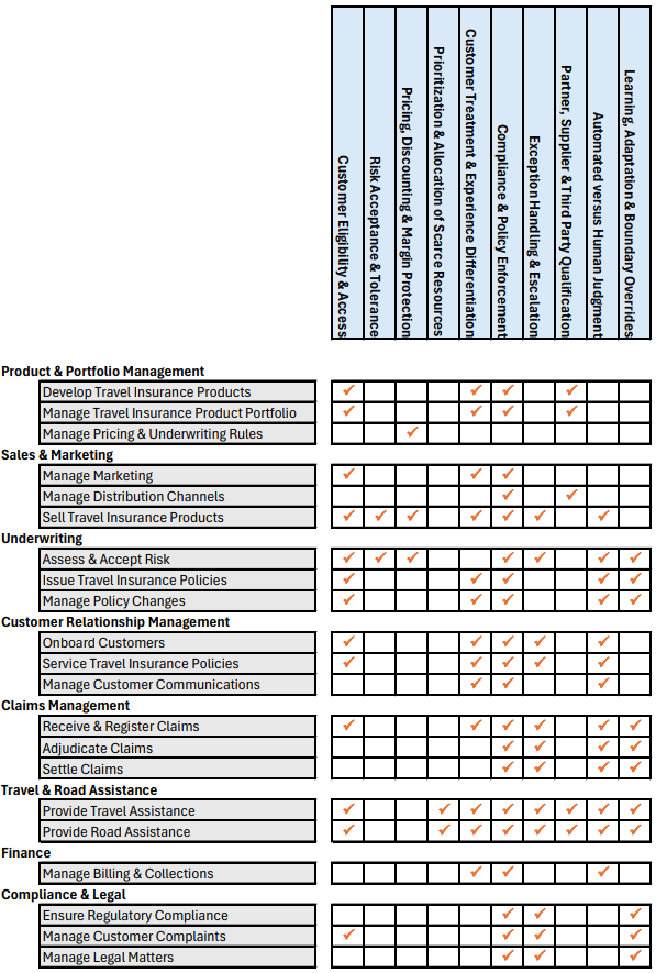 Consider a travel insurance company. Its core processes span product management, sales, underwriting, claims, assistance, finance, and compliance.